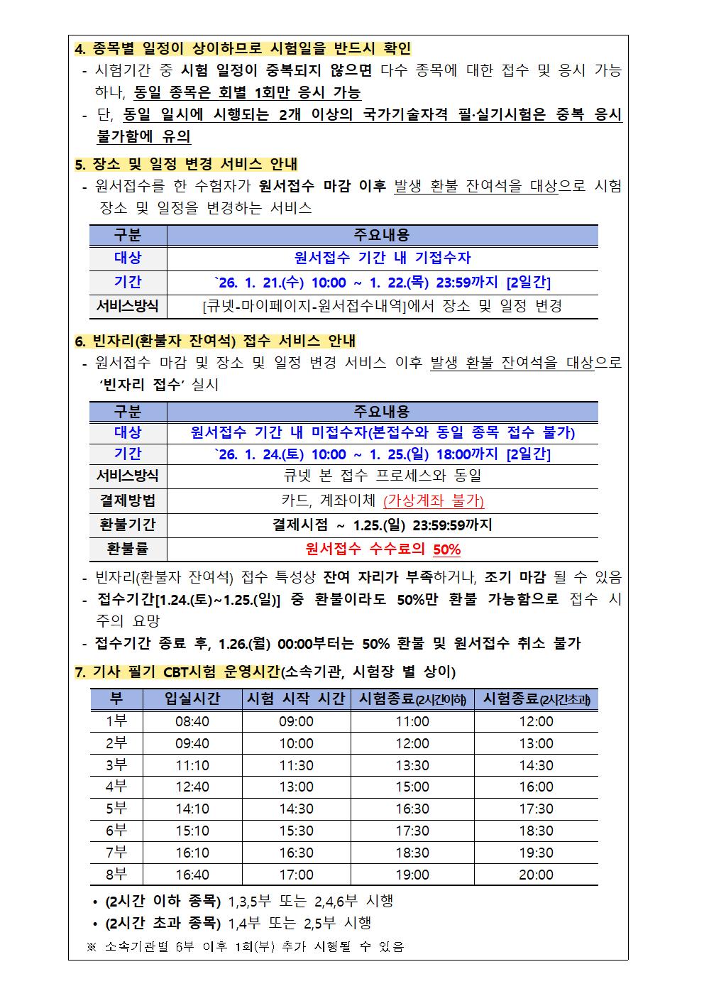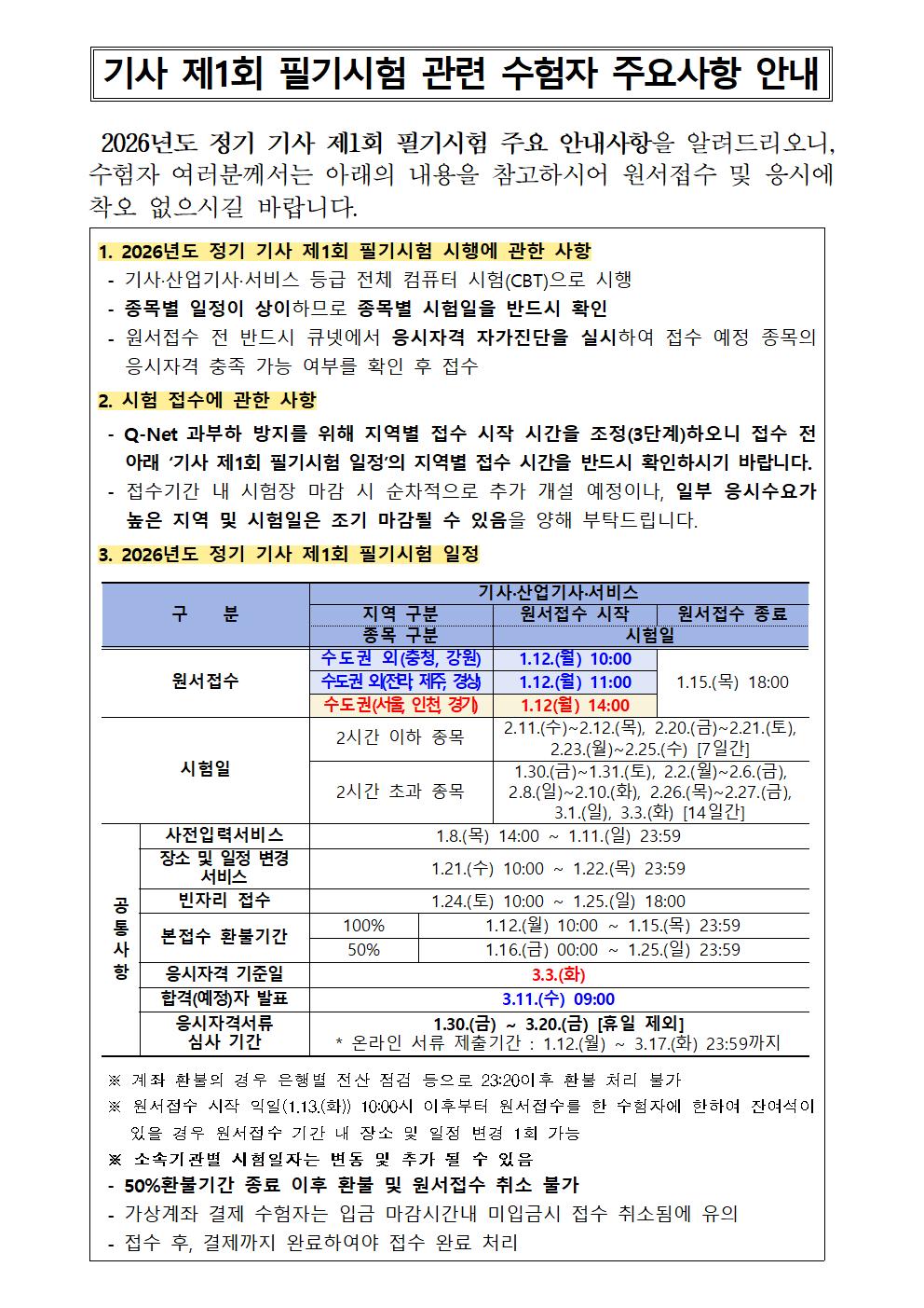 2026년도 기사 제1회 필기시험 원서접수 주요사항을 붙임과 같이 안내드리오니, 수험자 여러분께서는 붙임내용을 참고하시어 원서접수 및 응시에 착오 없으시기 바랍니다.