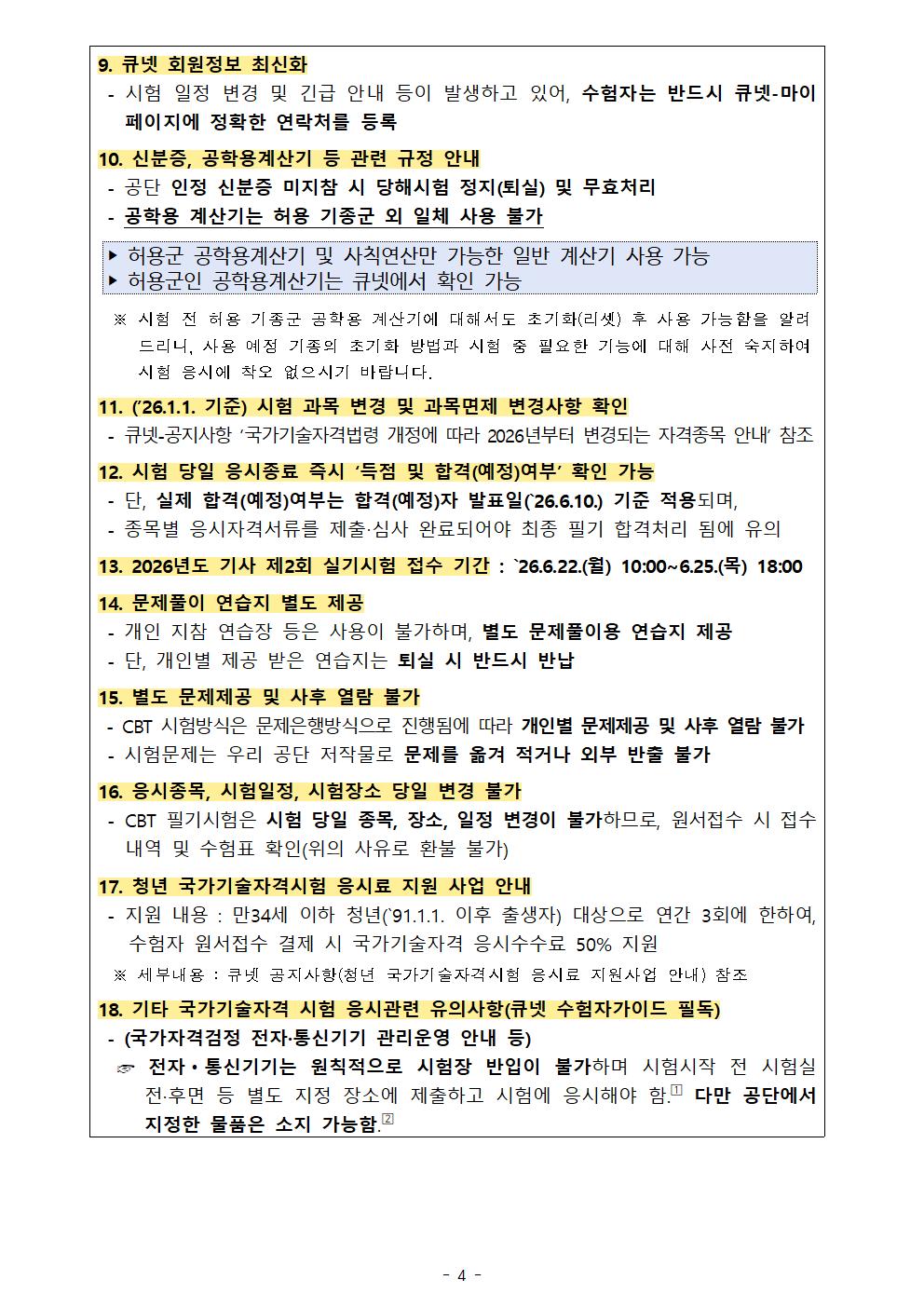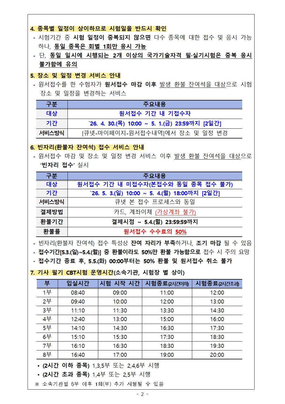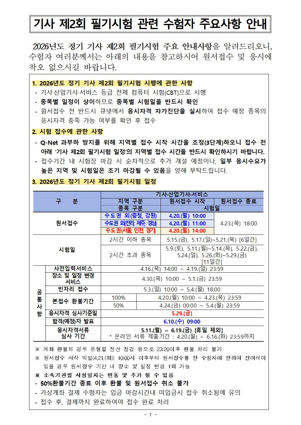 2026년도 기사 제2회 필기시험 원서접수 주요사항을 붙임과 같이 안내드리오니, 수험자 여러분께서는 붙임내용을 참고하시어 원서접수 및 응시에 착오 없으시기 바랍니다.