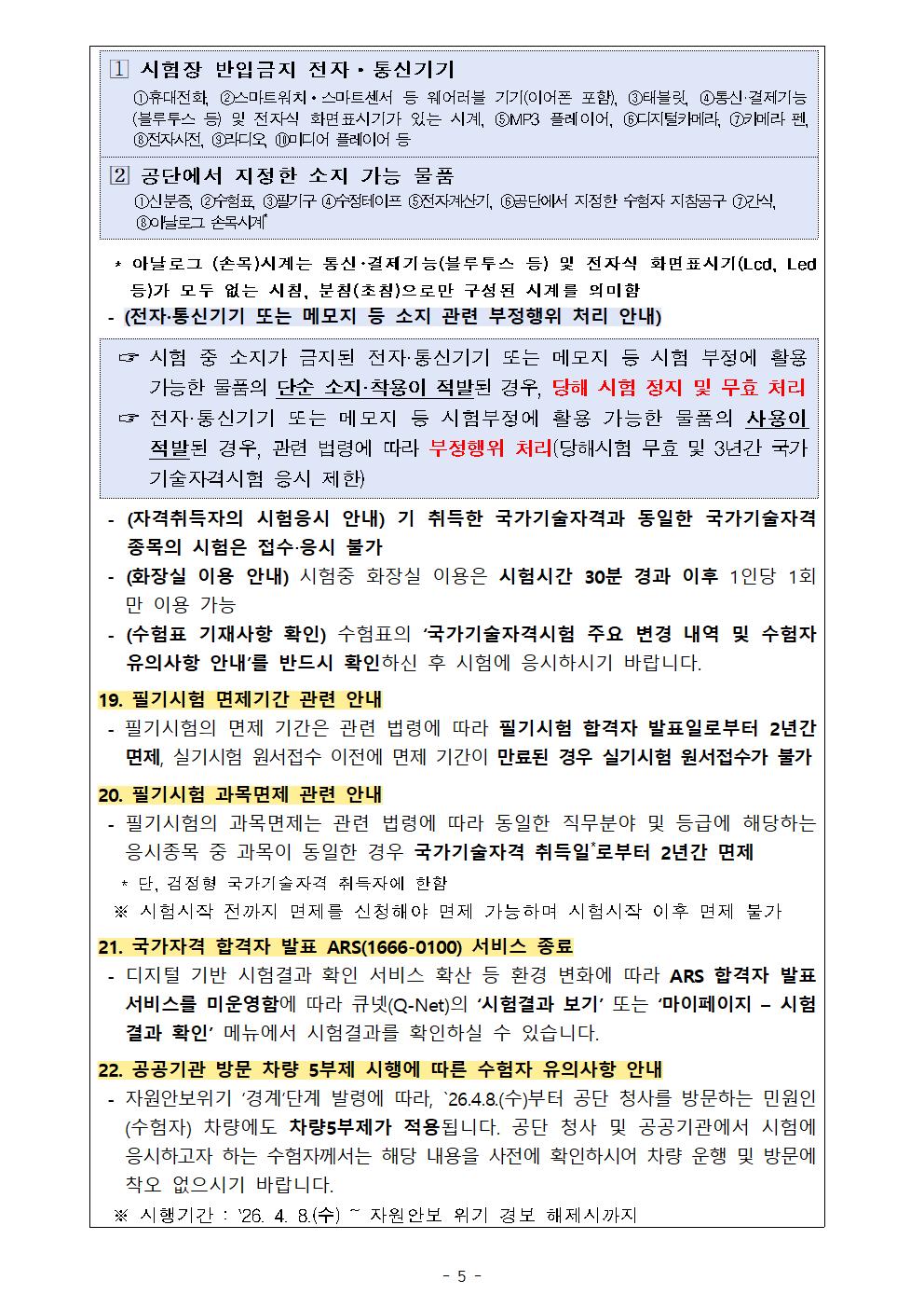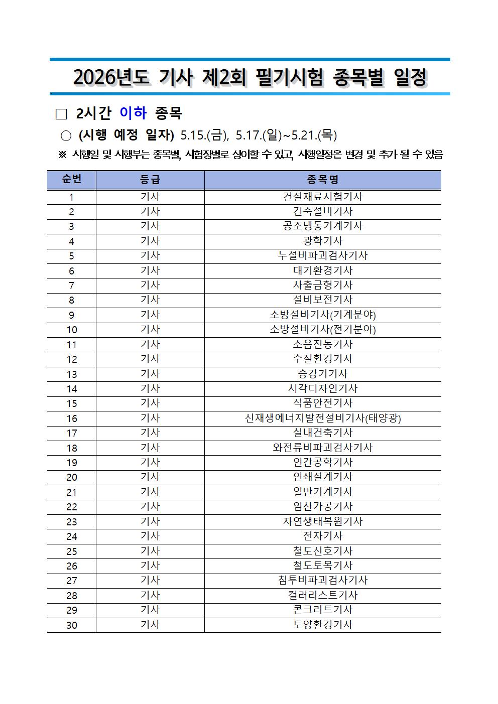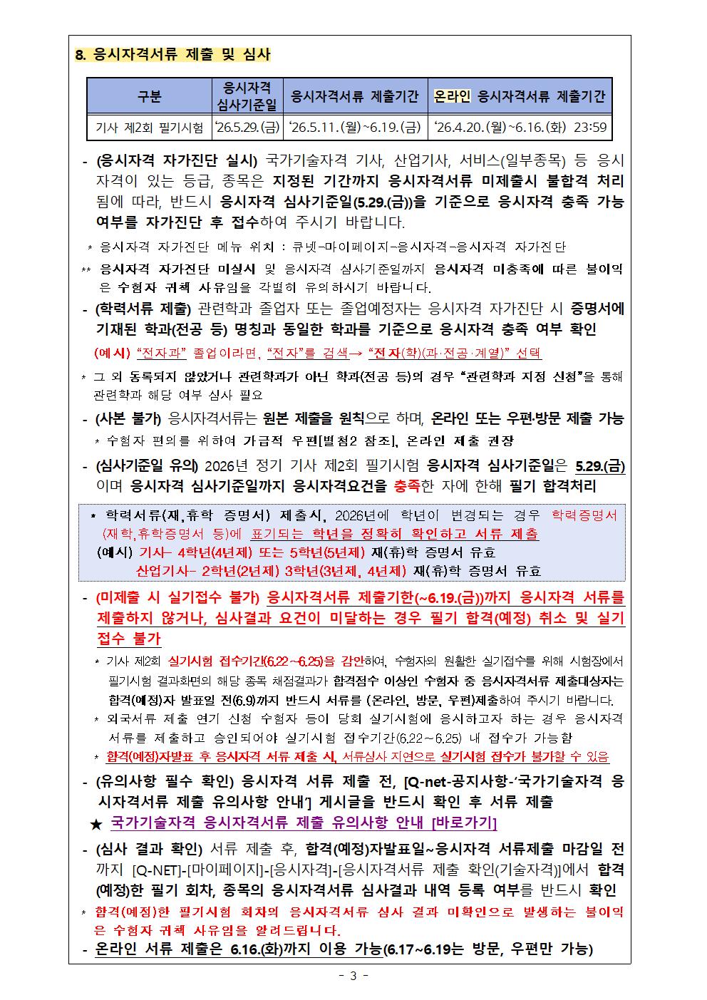 2026년도 기사 제2회 필기시험 원서접수 주요사항을 붙임과 같이 안내드리오니, 수험자 여러분께서는 붙임내용을 참고하시어 원서접수 및 응시에 착오 없으시기 바랍니다.