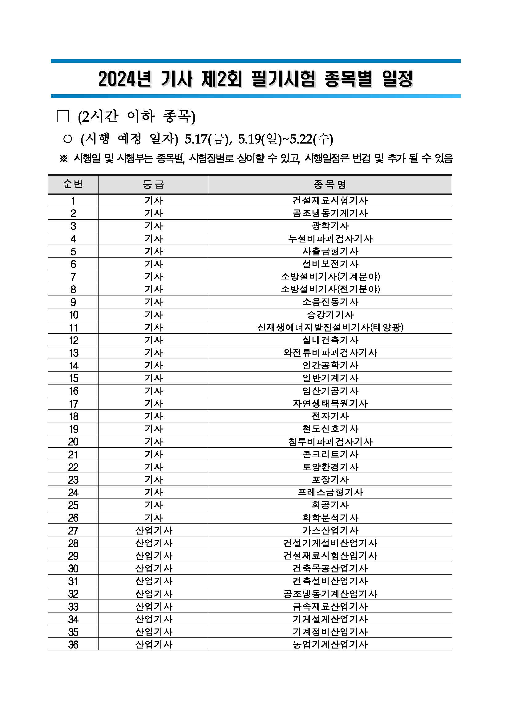 [4][붙임2] 2024년 기사 제2회 필기(CBT) 종목별 일정.pdf