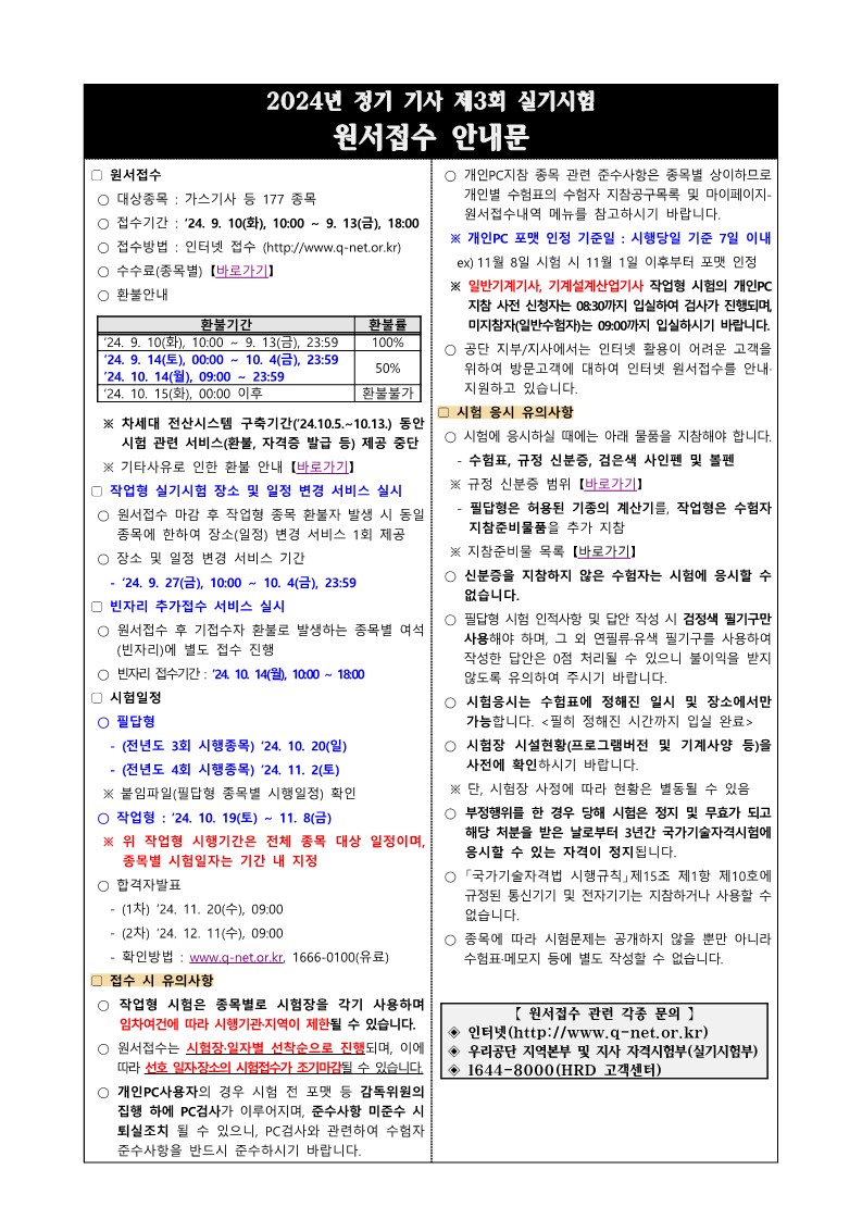 2024년도 기사 제3회 실기시험 원서접수 안내문, 필답형 시험일정 및 시험장, 작업형 시설장비 현황(예정)을 공지하오니 원서접수 시 참고하시기 바랍니다.
