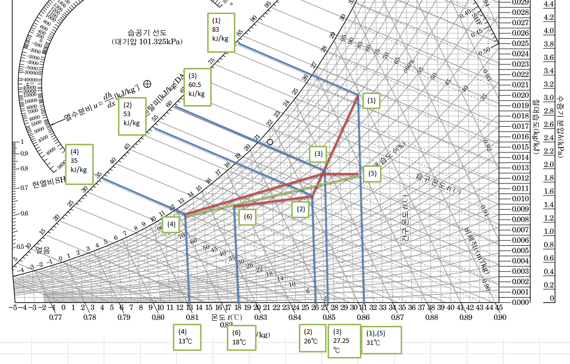 실제 이중덕트 계산은 상당히 복잡하며 실기 문제로 나오는 상황은 이중덕트의 개념 이해를 파악하기 위한 문제로 생각하시면 됩니다.