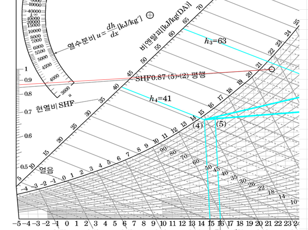 기출문제 384p 습공기선도에서 현열비선이 교재에서 0.87인데