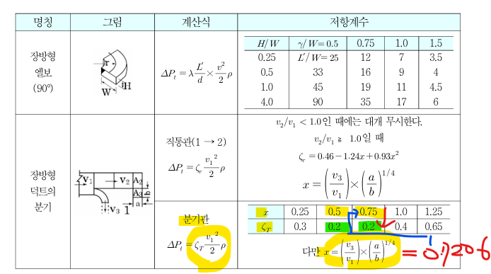 교재 왼쪽 장방형 덕트의 분기에서 분기관의 저항 식과 표를 보게 되면