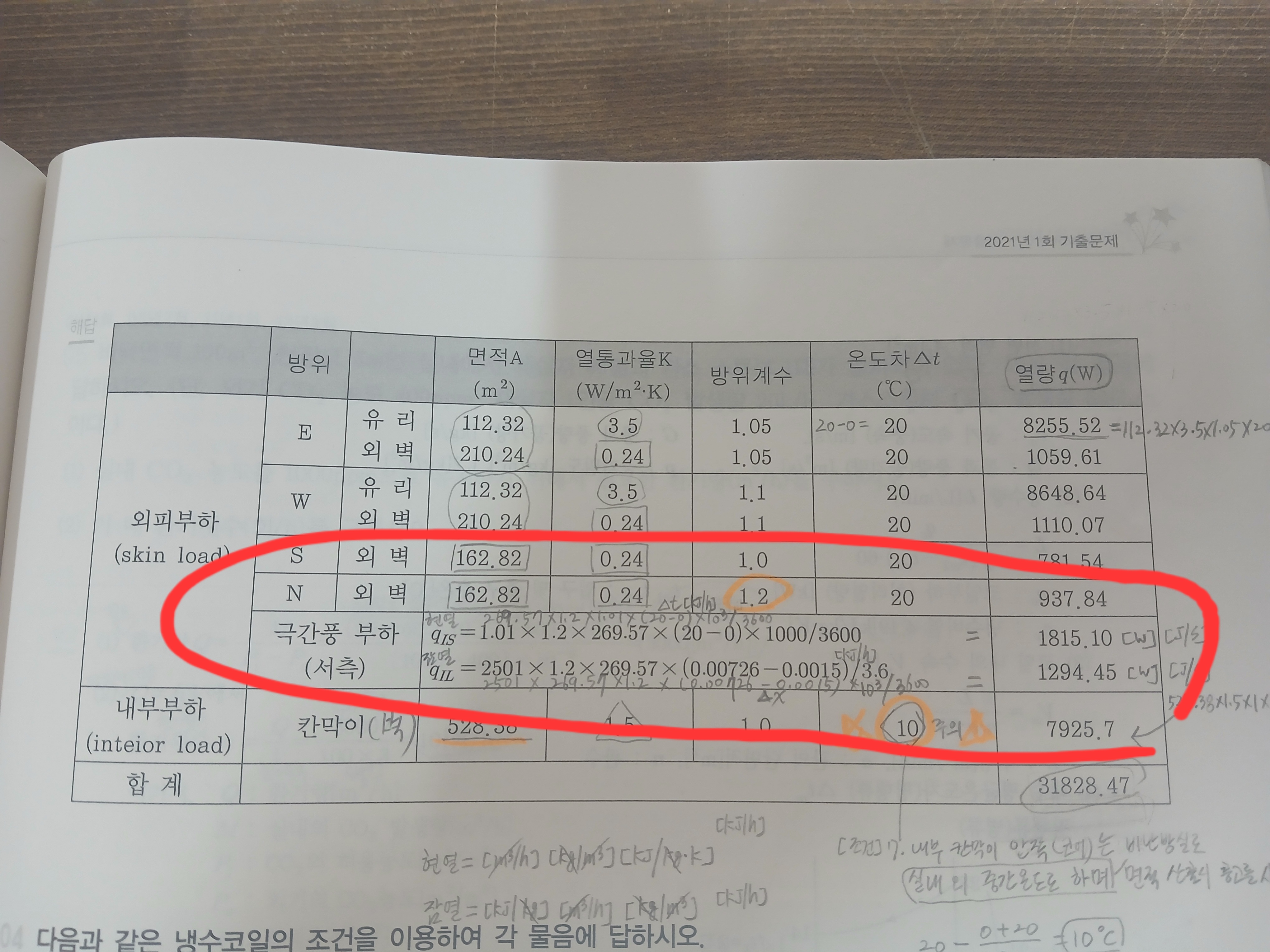 이때는 실내 외 절대습도 조건 유무를 파악하여 절대습도가 주어진 경우 계산을 하고 주어지지 않은 경우는 무시하고 현열 만 계산하면 됩니다.