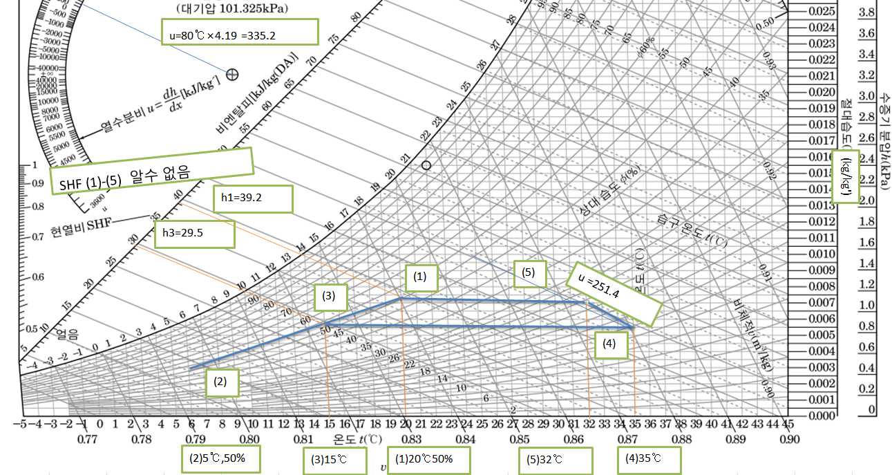 해당 문제는 실내외 습도 조건이 없고 실내 현열비 및 가습조건이 없어 선도를 표시할 수 없기 때문에 선도를 교재에 삽입하지 않았습니다.