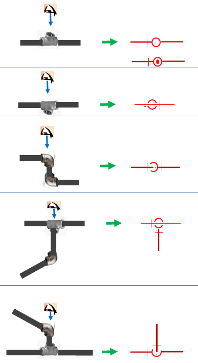 이때 입상(오는 엘보) 또는 입하(가는 엘보)되는 엘보 또는 티를 위에서 바라보는 관점으로 도시하는데