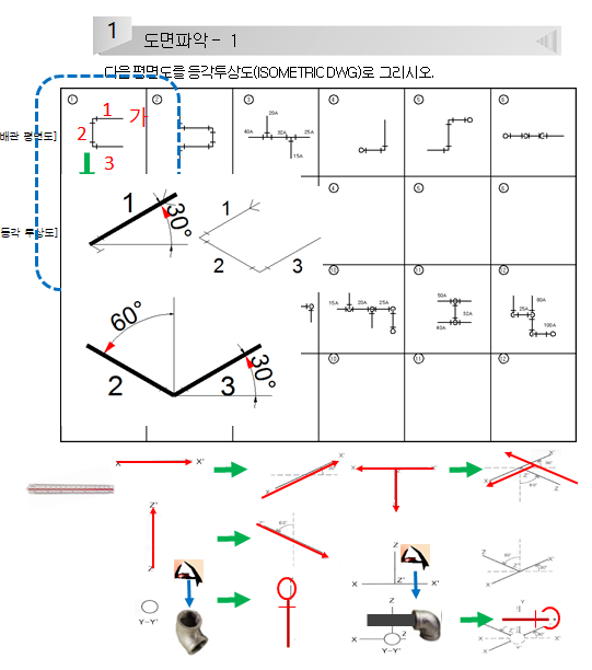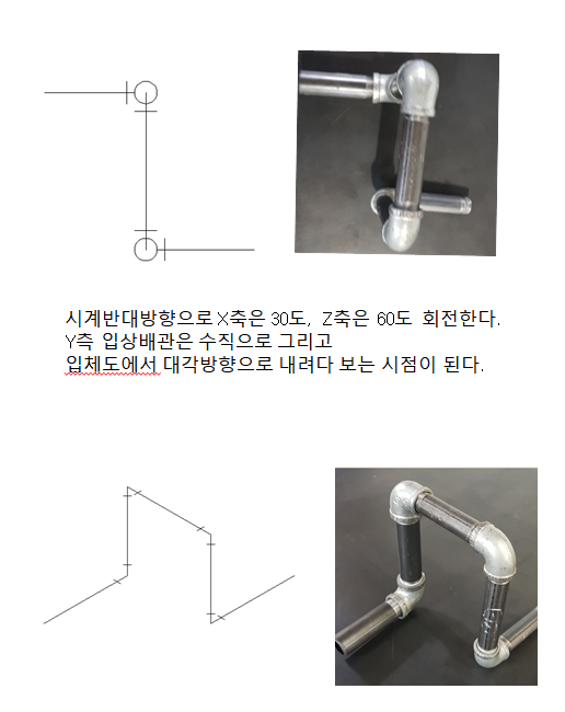 등각투상도는 평면도상에서 볼 수 없는 부분을 입체의 관점에서 각 수직수평입상배관을 120도 각도가 되는 등각투상으로 그려 입체도로 표현한 부분을 말합니다.