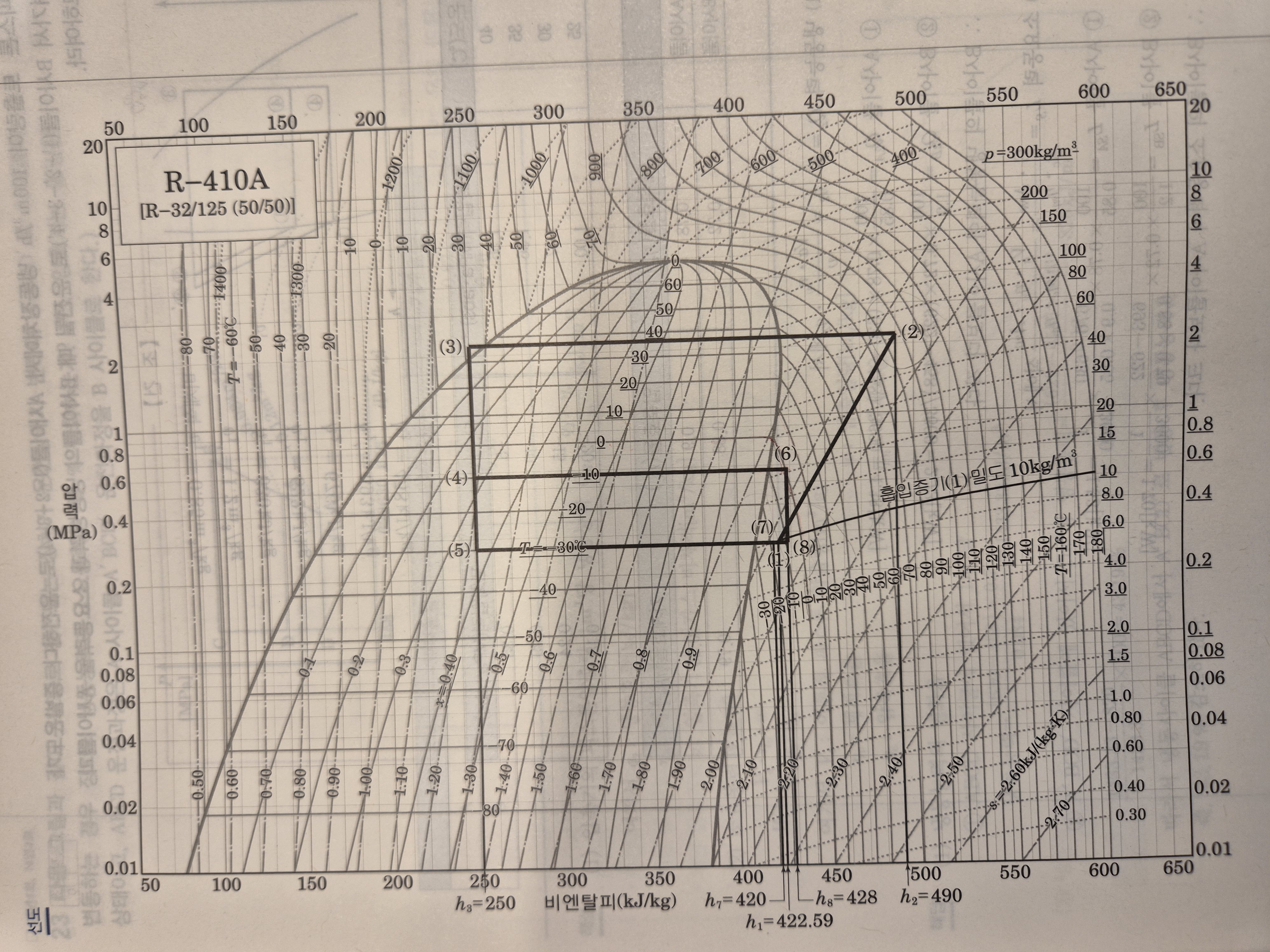 3. (응축기 입구)압축기 출구 2점은 응축온도에 해당하는 등압선과 압축기 흡입점1에서 등엔트로피선(우상향 곡선)을 따라 올라간 선과의 교점입니다.