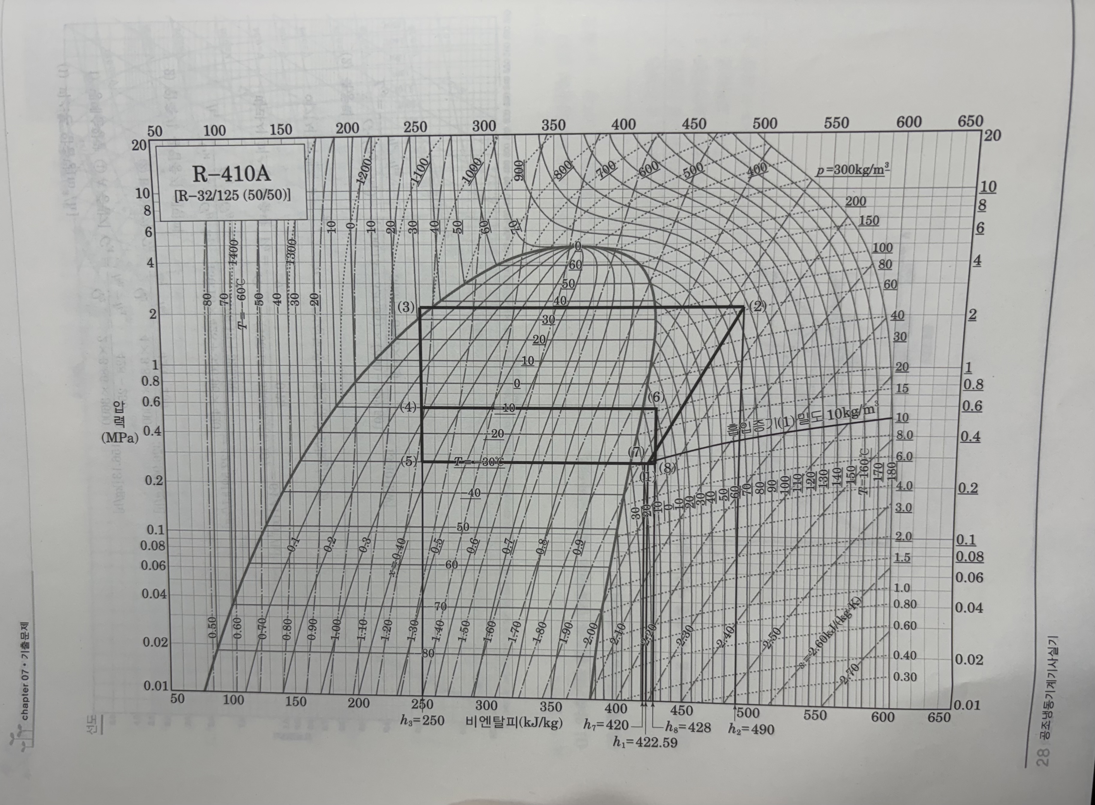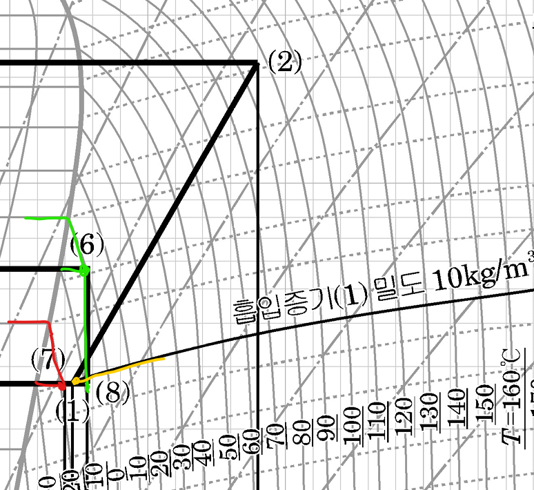 우선 (7)번 점은 저온증발(B증발기)온도 -30℃에서 과열도 10℃가 조건이므로 등압상태로 -30℃에서 10℃도씨 상승된 -20℃ 의 온도점이 됩니다.