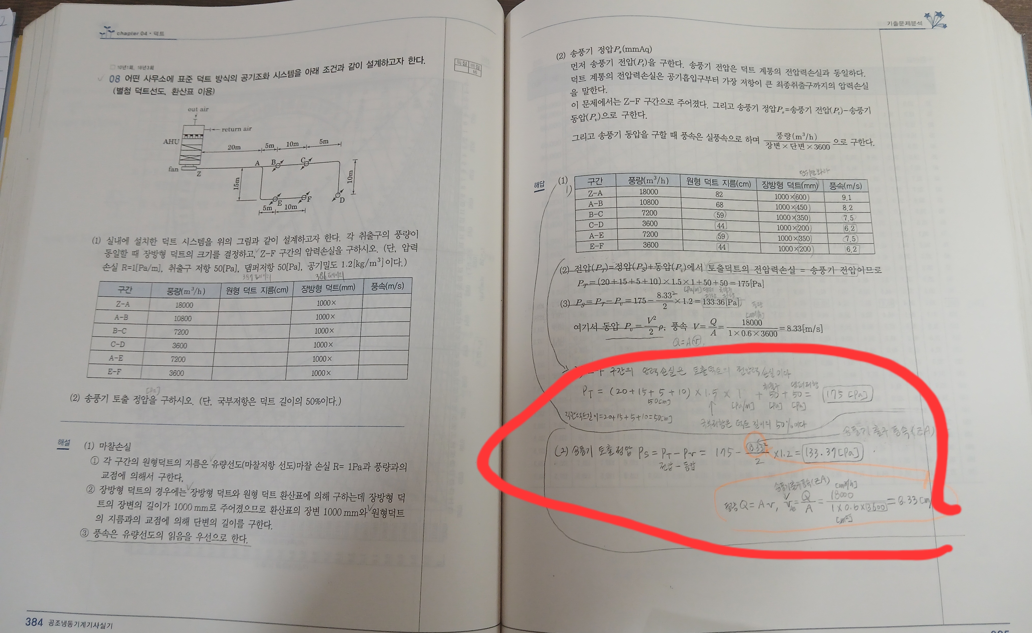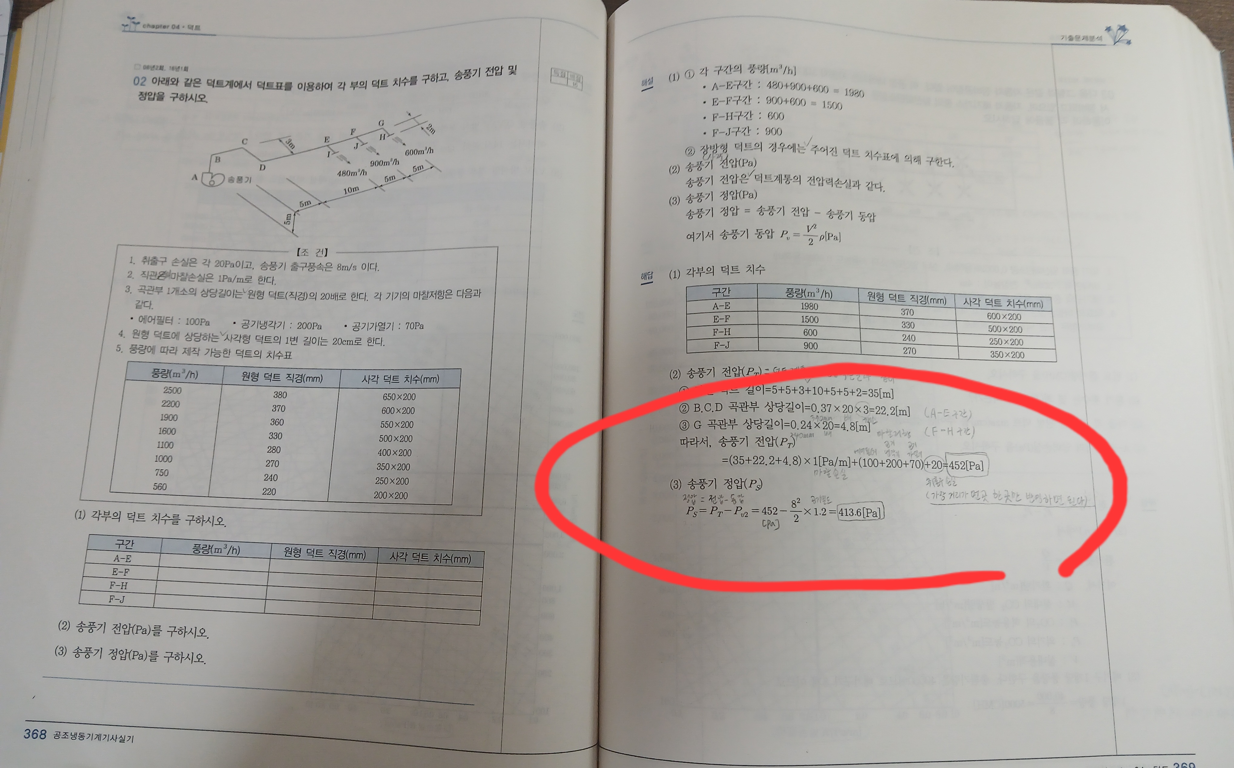 극히 일부 문제이지만 전손실을 정압으로 하는 출제자 입장에서는 속도조건을 주지 않는 경우가 있는데 이때는 덕트의 전손실을 정압으로 하여 동압을 구하지 않고 계산하는 문제도 극히 일부이지만 간혹 있습니다. (솔직히 이 경우는 수험자가 판단하기 힘든 조건이므로 동압을 구할 수 있다면 동압을 구해 덕트 전손실인 전압에서 동압을 빼 정압을 구하는 것으로 일단 학습하시기 바랍니다.)