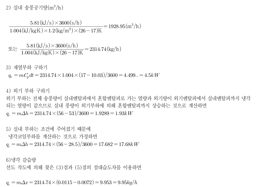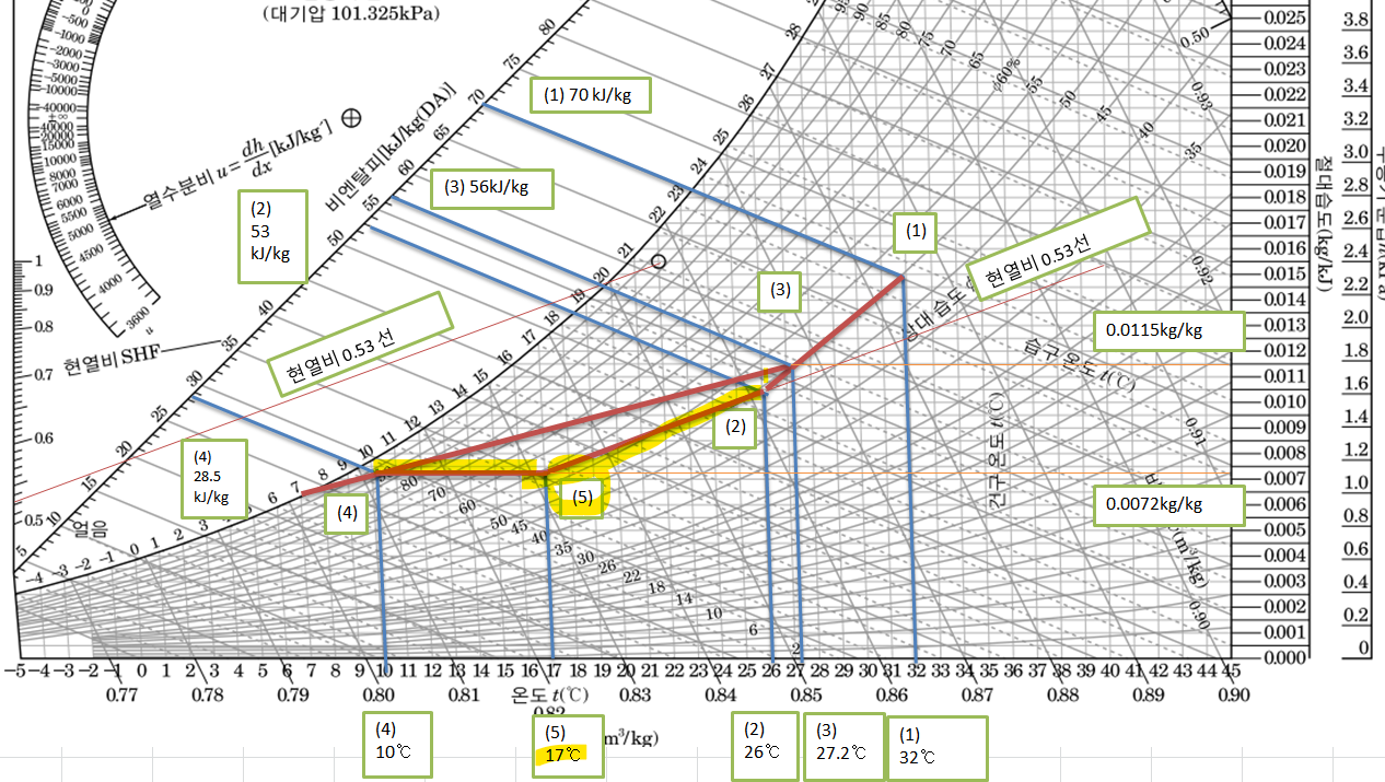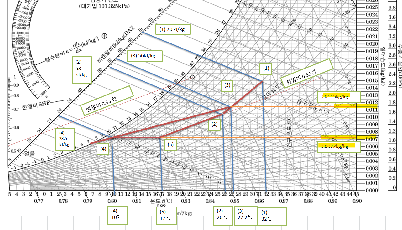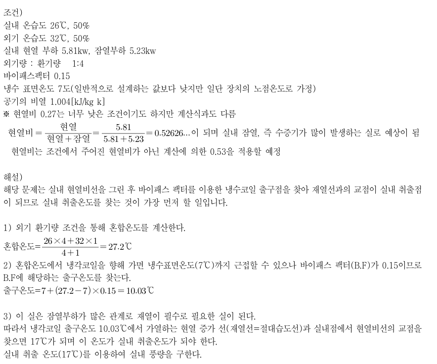 실내 현열 부하 5.81kw, 잠열부하 5.23kw 외기량 , 환기량 1:4 이고 실내오도 DB 26도, 상대습도 50% 외기 DB 32도, 삳대습도 50% 바이패스팩트 0.15 냉각수 표면온도 7도