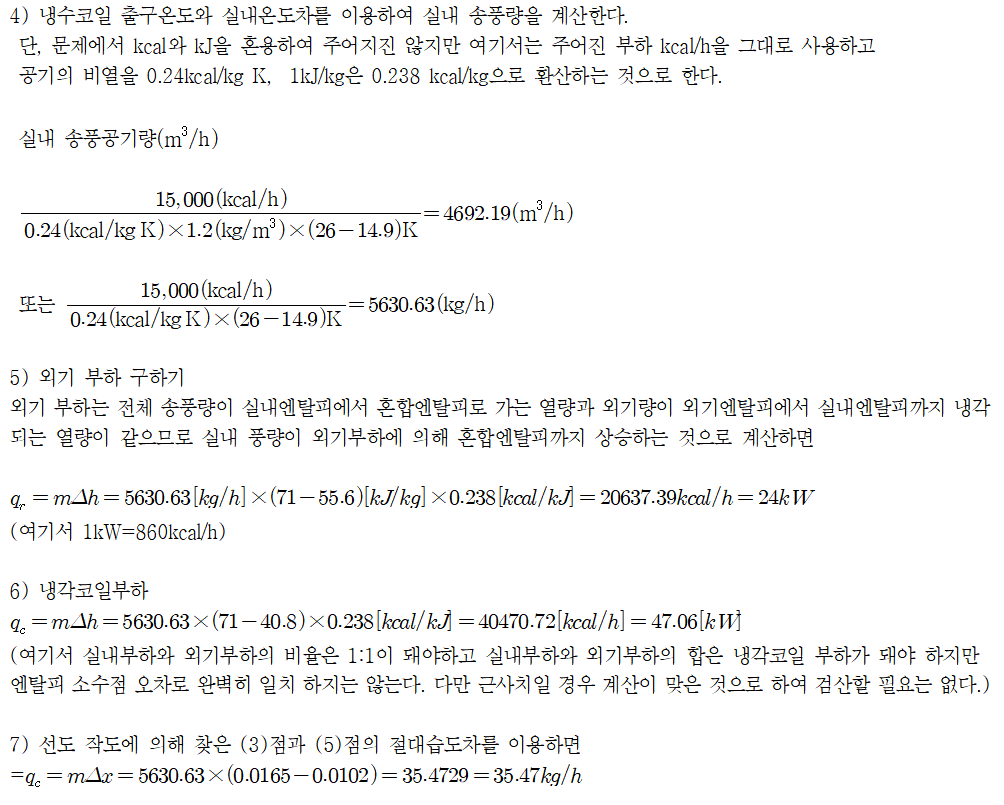 해당 문제는 부하가 kcal/h로 기존에 사용하던 열량단위이고 비열은 kJ/kg K로 서로 맞지는 않지만 기존 kcal/h로 계산해서 현재 SI단위 체계로 변환하는 것으로 풀이하겠습니다.