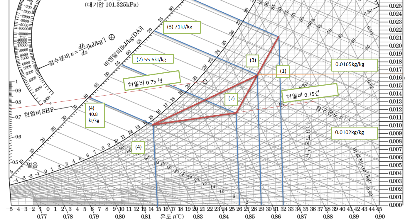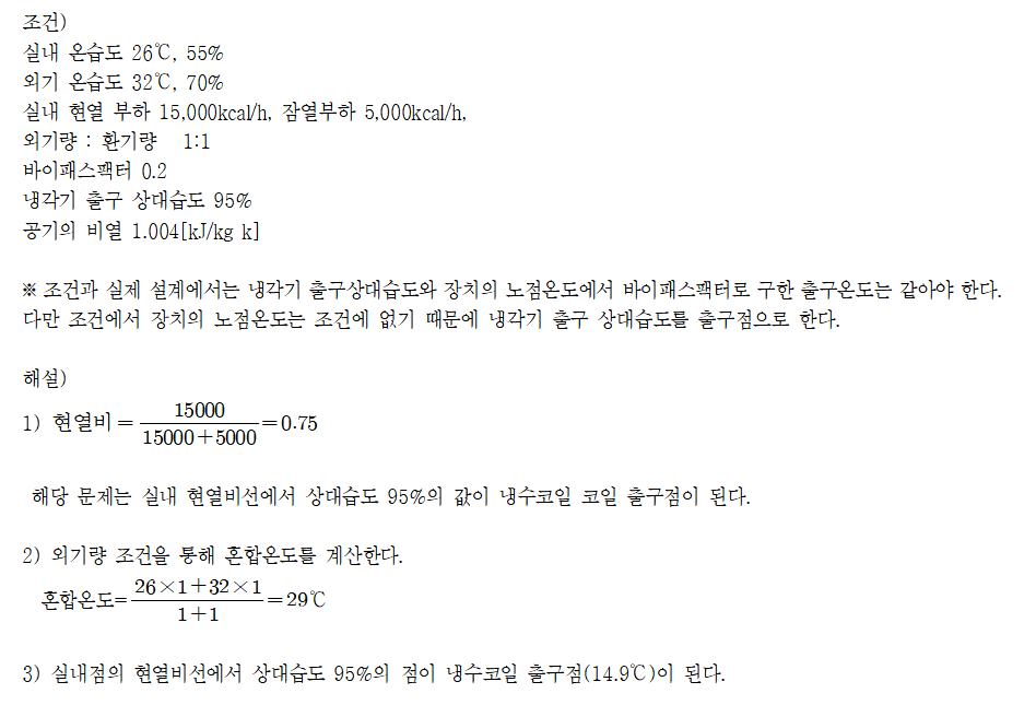 실외 현열부하 gs=15,000kcal/h, gl=5,000kal/h, 외기 32도, 습도70%, 실내온도26도,55% BF=0.2 이다. 외기와 환기의 1:1일 때 냉각기의 출구공기 상대습도 95% 이다.