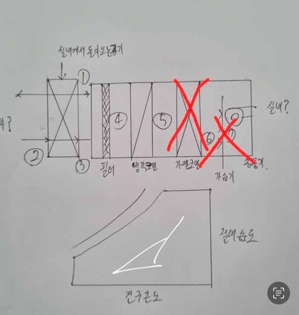 2) 해당그림이 맞다면 배기와 외기를 포함하여 그린 열교환기 표현은 코일처럼 박스로 표현했지만 전열교환기입니다.