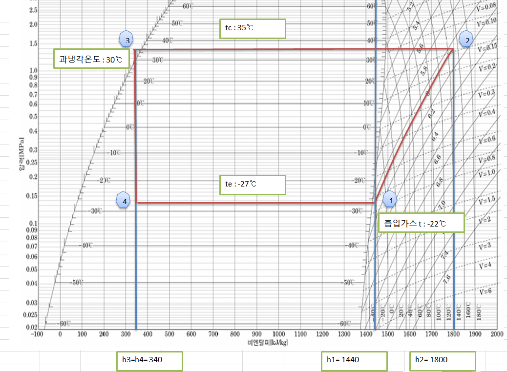 선도를 작도하면 h1=1440kJ/kg, h2=1800kJ/kg, h3=h4=340kJ/kg,