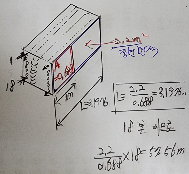 코일 가로길이 1m에 0.688m2이라서 2.2m2의 정면면적에 해당하는 코일의 가로길이는 약 3.2m 정도라고 생각하면 될 듯 합니다.