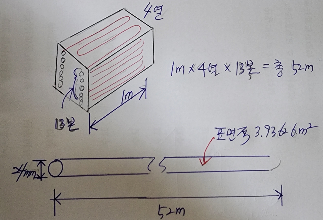 필요한 표면적은 3.93626m2 가 되고 지름 24mm의 둘레길이 0.07536m와 배관의 길이의 곱이 3.93626m2 이 되야 하므로 배관의 길이는 약 52m가 되고
